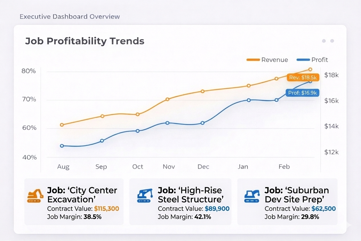 Custom, always-accessible dashboards built in Microsoft Power BI. Executives gain real-time visibility into critical metrics: profitability, productivity, equipment utilization, safety trends, and more.